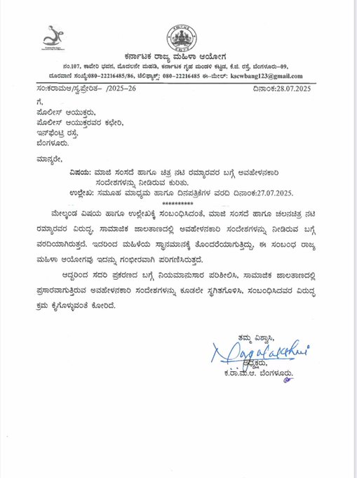 ಬೆಂಗಳೂರು ಕಮಿಷನರ್‌ಗೆ ದೂರು ಕೊಟ್ಟ ನಟಿ ರಮ್ಯಾ!